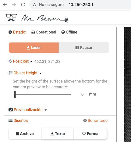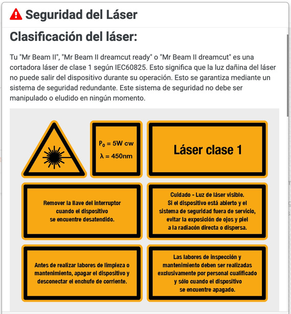 Despois da conexión aparecen as instruccións de seguridade. Unha gravadora láser é unha máquina que pode mancar o operador se non segue as normas de seguridade. Hai que ir ata o final, ler e aceptar as condicións antes de empezar a usar a gravadora.