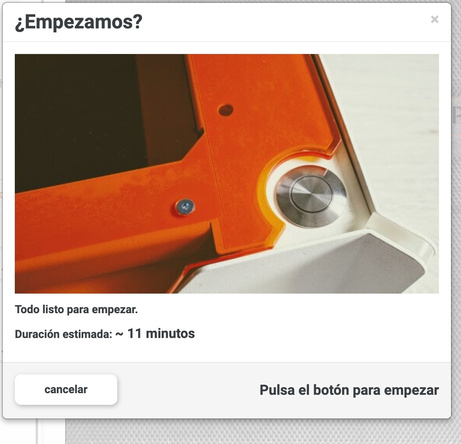 Unha vez axustados os parámetros, prémese en “empezar” .A máquina procesa a imaxe, e pide que se prema o botón de inicio para empezar o traballo.Por seguridade, a tapa da gravadora ten que estar pechada (o láser queima e a zona na que ataca o material dana a vista).