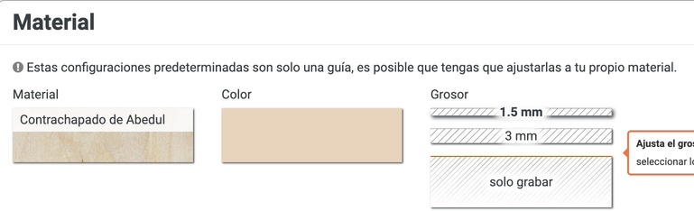 Na seguinte pantalla poderán axustarse os parámetros do material (indicando o grosor, etc.). Con algúns non deixa cortar. Pódense intentar cortar cambiando de material e axustando a man os parámetros para que corte (o máis probable é non ter éxito).Para crear uha nova capa, pinchar na icona da cor e levala a outra zona.As capas gravaranse por orde. Ollo con poñer as capas de corte exterior de últimas. E as de gravado ó