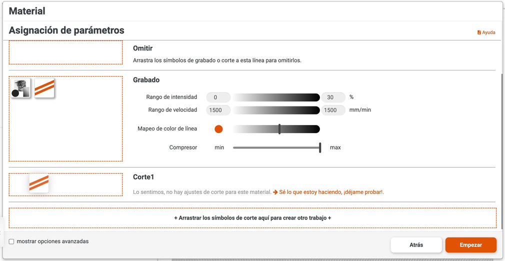 Unha vez seleccionadas as capas poderanse axustar a man os parámetros de gravado e corte. Hai unha versión básica e unha avanzada. Poñendo e mantendo o cursor do rato por riba do parámetro aparece unha axuda explicando o que é.