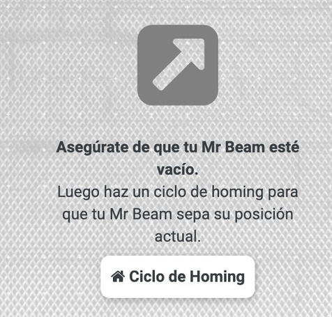 Unha vez aceptadas as condicións de seguridade, aparece unha pantalla incicando facer un “ciclo de homing”. Básicamente é para levar o cabezal a un sitio de referencia (“coñecido” para a máquina).